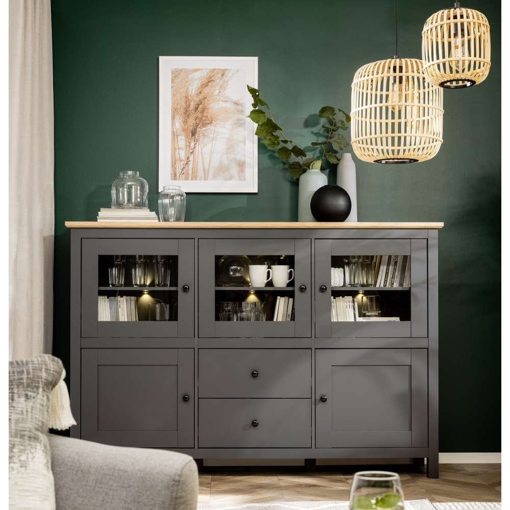 Skjenk Hesen 186x126 cm - glassdører - 2 skuffer - grafitt