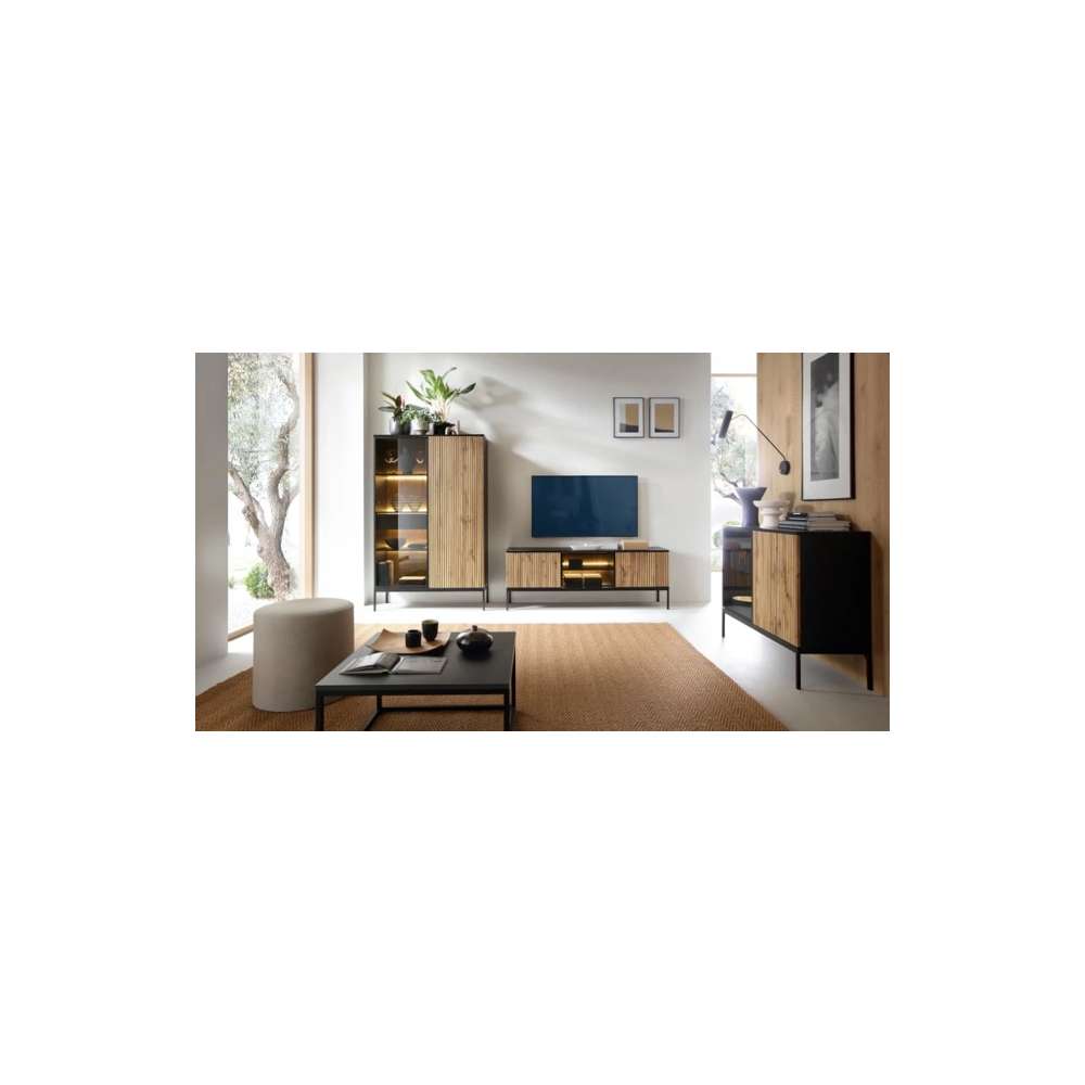 Skjenk SENTO - sort med eik - høye ben - med belysning